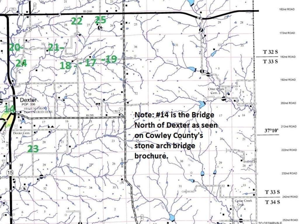 The old newspapers indicate that Dexter Township had a definite focus towards building roads on the east side of Dexter, and this may explain the fact that all 9 stone culverts we “discovered” in the township were on the east side of Dexter. In fact, with the exception of the second 251st Road culvert (demolished in 2024), all were found on the northeast side of Dexter. Below is a map showing the locations of these culverts, which is taken from our complete Cowley County stone arch bridge map shown on our Cowley County stone bridge page, the base of which is courtesy of the Kansas Department of Transportation. The numbers on the map correspond with the numbers on the bridges in the photo gallery above.