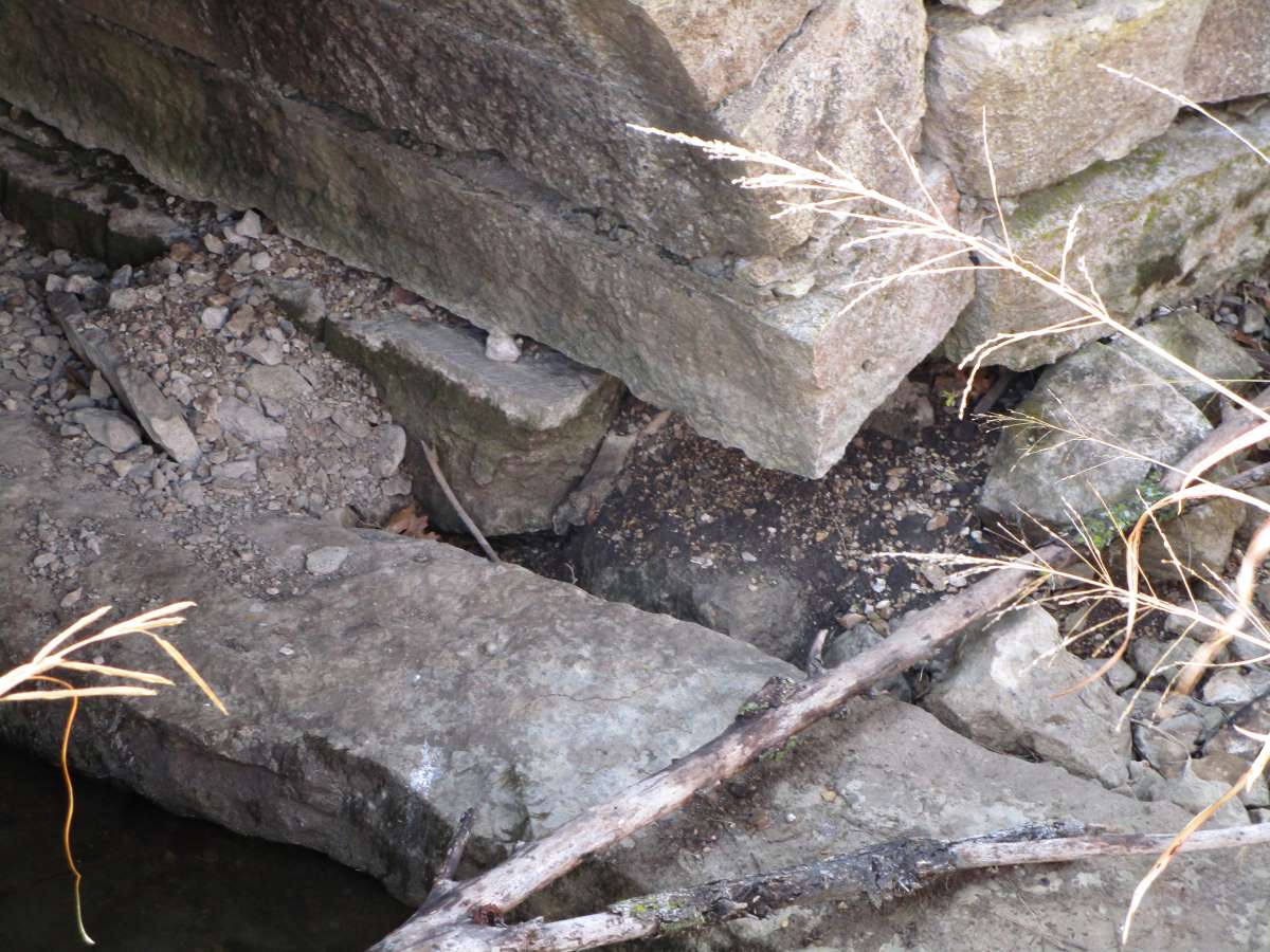 Under the culvert there are several large stones as well. It is hard to say if they were originally part of the culvert or maybe an outcropping the culvert rests on. There is some damage to the arch, where a small section of the arch appears to be suspended over space; it is unclear if the foundation has washed away or there was a stone here that is now missing. Also, there may be some minor undermining of the remaining visible approach wall, which appears to rest on a gravel foundation and is paralleled by a ditch. That said, there is nothing here that couldn’t be easily rectified with a simple concrete scour apron, and otherwise the arch appears to be in good, stable condition.