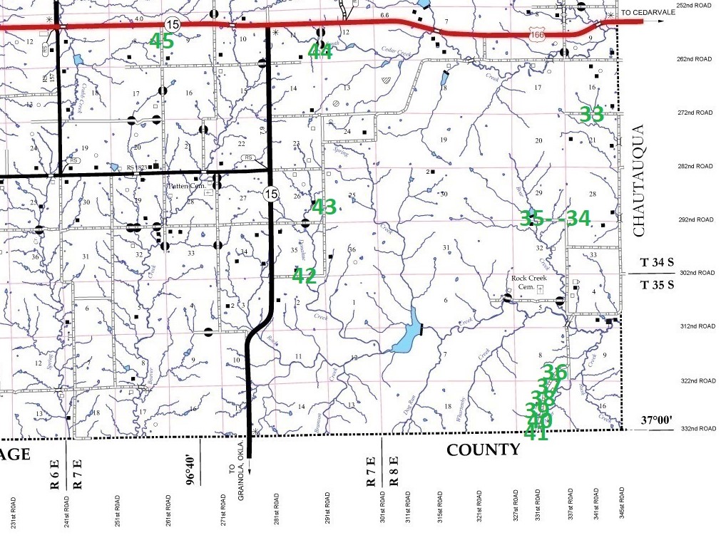 The 13 culverts we found are all in the southeast corner of Cowley County. The exact locations are shown in this clipping from our Cowley County stone arch bridge map: