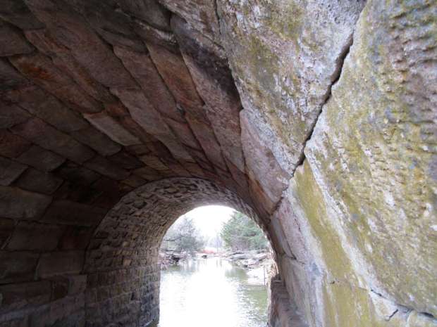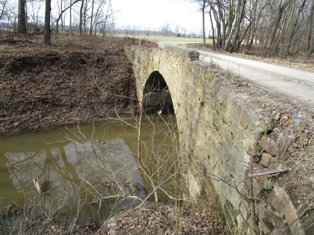 The original portion of the stone arch bridges is probably c. 1900, for newspapers show that Oak Valley Township was busily engaged in building stone culverts out of the superb sandstone available locally.